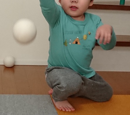 結局この日はずっと手放さなかった。いや、ほんとに。よく跳ねるしちょうどよい。天然ウール100%ということで、安心なおもちゃです笑