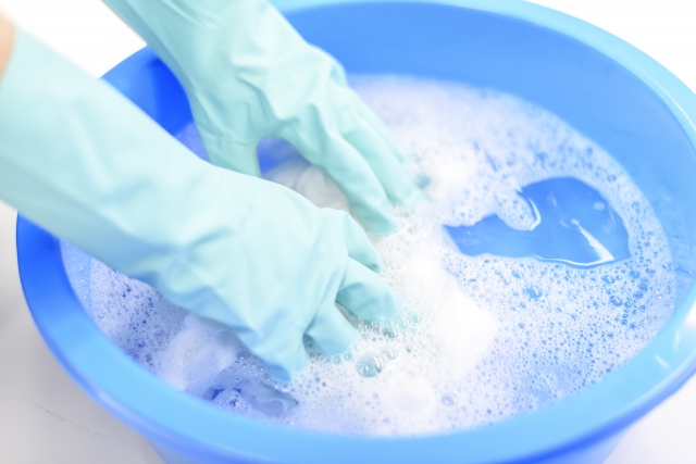 3.漂白剤を入れて泡立った洗面器の中に、衣類をしっかり浸して30分ほどつけ置く